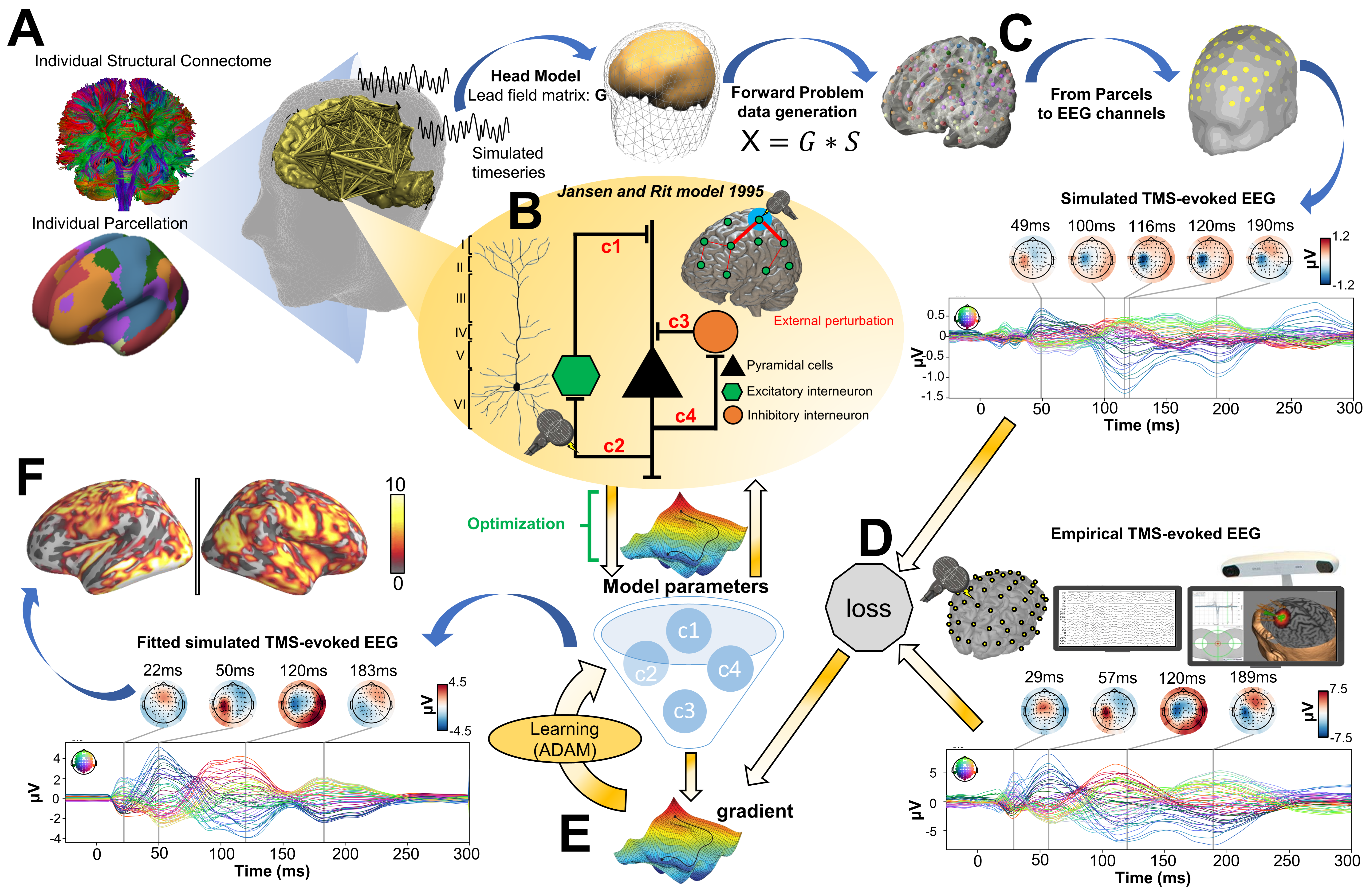Grand-mean structural connectome was calculated using neuroimaging data of 400 healthy young individuals (Males= 170; Age range 21-35 years old) from the Human Connectome Project (HCP) Dataset. The Schaefer Atlas of 200 parcels was used, which groups brain regions into 7 canonical functional networks (Visual: VISN, Somato-motor: SMN, Dorsal Attention: DAN, Anterior Salience: ASN, Limbic: LIMN, Fronto-parietal: FPN, Default Mode DMN). These parcels were mapped to the individual’s FreeSurfer parcellation using spherical registration. Once this brain parcellation covering cortical structures was extrapolated, it was then used to extract individual structural connectomes. The Jansen-Rit model 22, a physiological connectome-based neural mass model, was embedded in every parcel for simulating time series. The TMS-induced polarization effect of the resting membrane potential was modeled by perturbing voltage offset uTMS to the mean membrane potential of the excitatory interneurons. A lead-field matrix was then used for moving the parcels’ timeseries into channel space and generating simulated TMS-EEG activity. The goodness-of-fit (loss) was calculated as the spatial distance between simulated and empirical TMS-EEG timeseries from an open dataset. The corresponding gradient was computed using Automatic Differentiation. Model parameters were then updated accordingly using the optimization algorithm (ADAM). The model was run with new updated parameters, and the process was repeated until convergence between simulated and empirical timeseries was found. At the end of iteration, the optimal model parameters were used to generate the fitted simulated TMS-EEG activity, which was compared with the empirical data at both the channel and source level.